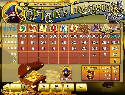 Ставка на одну игровую полосу колеблется от 1 до 5 центов. Наивысшая ставка на спин достигает 45 долларов США. Наивысшая выплата видео софта Captain’s Treasure достигает 25 тысяч долларов США.