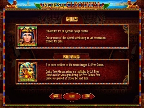 В слоте Riches of Cleopatra также предусмотрены и 15 бесплатных вращений. Но, чтобы их получить, необходимо собрать комбинацию из 3 и более золотых масок. Во время бесплатных фриспинов учитывается последняя ставка, а кредиты при этом остаются в целости и сохранности.